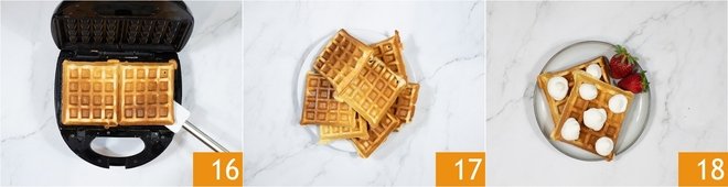 Place the waffles on a plate using a spatula 16 when nice and golden. If they are stuck together simply cut them apart. Repeat until the batter finishes 17. With these amounts you should end up with 10 waffles, 4"x 5" each. Beat the cream with the sugar and use it to decorate the waffles. Add the strawberries and serve 18.