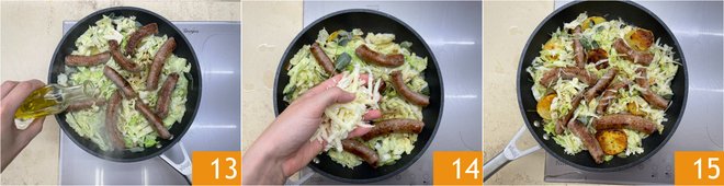 Flavor with the sage leaves 10. Cover with a lid 11 and cook on a medium flame for around 10 minutes. Check that both the potatoes and cabbage are done, then add the sausage 12.