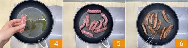 Cut the sausage into pieces that are roughly 4 inches long, heat a drizzle of oil in a pan and brown the sausage 4 on a high flame 5 until nice and golden. Remove the sausage 6 and keep it hot.