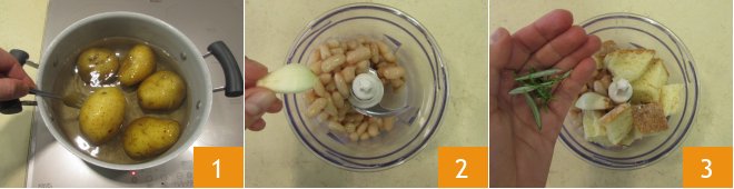 To make the cannellini bean bites, first boil the potatoes 1 for 30-40 minutes or until they are soft, checking with a fork: when it easily reaches the center of the potatoes, they are ready. In the bowl of the mixer, add the drained cannellini beans, the garlic clove 2, the stale bread, and a few rosemary needles 3.