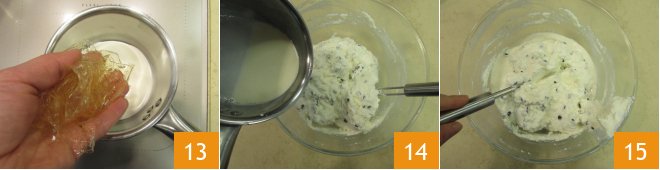 At this point, heat the cream in a saucepan, turn off the heat, and incorporate the gelatin, stirring well until it is completely dissolved 13; let it cool for a few minutes before pouring it into the bowl 14. Incorporate gently again, trying not to deflate the mixture 15.