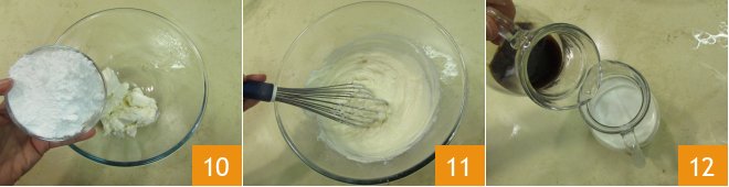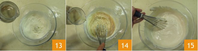 Add the milky coffee to the ricotta and mascarpone mixture 13, whisking to combine 14. The resulting mixture should be smooth and uniform 15.