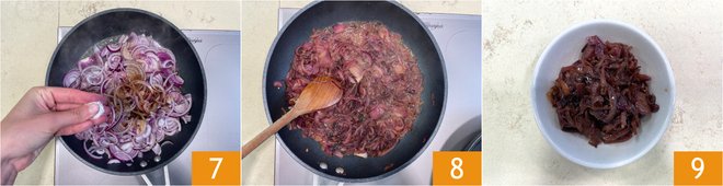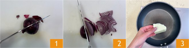 To prepare the caramelized onion, peel the red onions 1 and slice them thinly 2. In a pan, put a generous knob of butter 3.