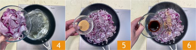 Melt it over low heat and then add the onions 4 with the brown sugar 5 and balsamic vinegar 6.