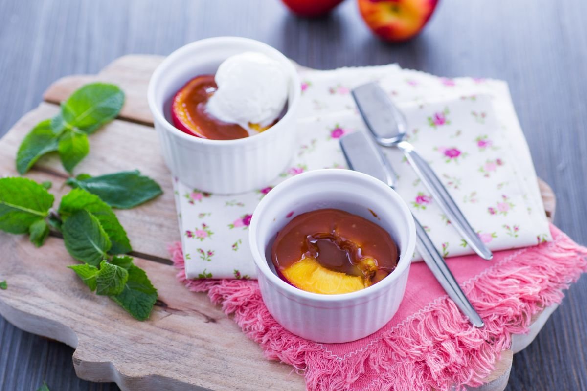According to food writer Niki Segnit, author of The Flavor Thesaurus, as a high-society lady in the early 1900s, you were nobody if you didn't have a peach-based dessert dedicated to you. Peaches cooked in vanilla and decorated with violets and sugar threads for Sarah Bernhardt, with champagne zabaglione for Empress Eugenia, or with alpine strawberry ice cream for Zola's muse. But today, let's start with the basics: caramelized peaches! The perfect dessert to prepare at the last minute for your guests to beautifully conclude a summer dinner. Warm nectarine peaches will be the perfect base to welcome a scoop of your favorite ice cream or some soft and creamy dollops of whipped cream. And for the most indulgent? The caramel sauce will satisfy even them! Prepare caramelized peaches, and all that will be left to do is find a diva to dedicate this dessert to... like your mom, for example!