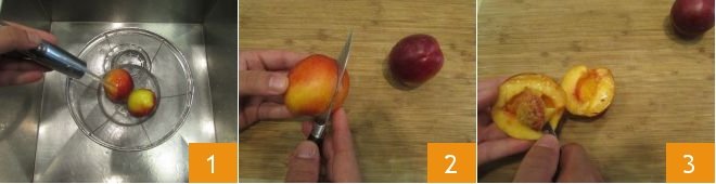 To prepare the caramelized peaches, start by preheating the static oven to 350°F, then move on to the peaches: wash them 1, cut them in half 2, and remove the pit by scoring it with a small knife 3.