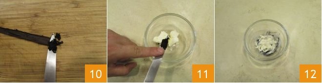 While the caramel is cooking, place the room temperature butter cut into pieces in a small bowl. Then, with a knife, scrape the seeds from the tip of the vanilla bean 10 and add them to the butter 11, mixing everything with a spoon to blend well 12.