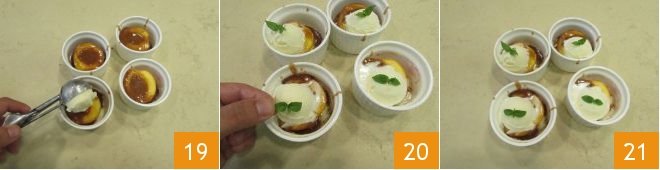 Add a scoop of your favorite ice cream 19, garnish with a mint leaf 20, and serve 21. Your caramelized peaches are ready to be enjoyed!