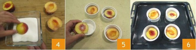 Dip the peach halves in sugar, flesh side down 4, then place them in small baking dishes 5 and transfer them onto a baking sheet or tray 6; then bake them in the preheated oven at 350°F for 25 minutes 6.