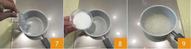 Meanwhile, take care of the caramel: in a large saucepan, pour the water 7 and add the sugar 8. Without stirring, turn on the heat and boil the water and sugar mixture 9 until you get a nice amber color.