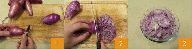 To prepare the caramelized Tropea onions, start by peeling them, removing both the skin and the two ends 1. Then move on to slicing, you can slice them not too thinly with a smooth blade 2, collect the obtained rounds in a container 3.