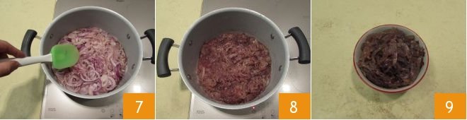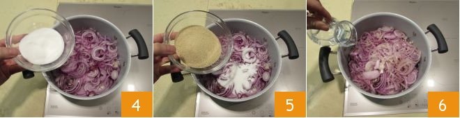 Pour the sliced onions into a large pan along with the granulated sugar 4 and the brown sugar 5, mix well so that the ingredients blend together well and add the water 6.
