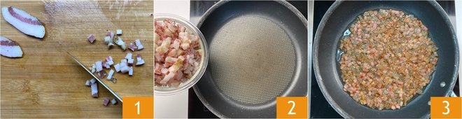 To make the carbonara supplì, first remove the rind from the guanciale and cut it into cubes 1. Place the guanciale in a well-heated pan 2 and sauté over medium heat for about ten minutes, stirring occasionally and being careful not to burn it 3. Once ready, drain the guanciale and set aside the fat released during cooking.