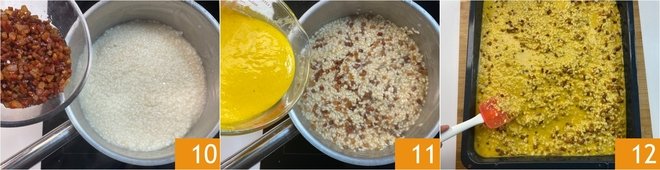 After the rice cooking time, check that it has absorbed all the water, then add the browned guanciale 10 and the egg mixture 11. Mix well to combine everything and adjust the salt if necessary, then transfer the seasoned rice onto a baking sheet 12 and let it cool to room temperature. Cover with plastic wrap and refrigerate for 12 hours.