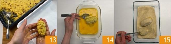After the cooling time, moisten your hands with water and take portions of rice of about 3.5 oz each. Form the supplì by compacting them well to obtain a cylindrical shape 13; with these quantities, you will get about ten. After forming all the supplì, proceed with the double breading: dip one supplì at a time first in the beaten eggs 14 and then in the breadcrumbs 15.