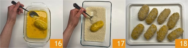 Repeat the breading by dipping the supplì again in the beaten eggs 16 and finally covering it with panko 17. Place the breaded supplì on a tray 18.