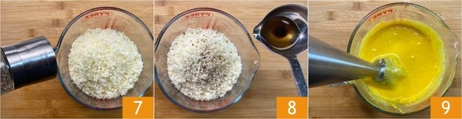 Pepper 7 and add the guanciale fat in a thin stream 8 while blending with an immersion mixer; alternatively, you can use a hand whisk. You should obtain a smooth and homogeneous mixture 9.