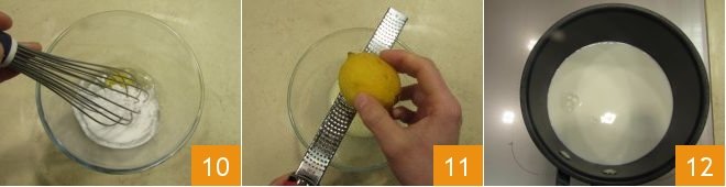 beat the ingredients with a whisk 10 by hand, then add the grated peel of an untreated lemon 11. Heat the milk in a saucepan 12