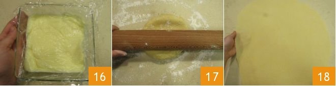 and cover with plastic wrap 16. The cream must be nice and cool before you use it. Once cooled, place it in a pastry bag with a serrated tip and leave in the refrigerator until you need to fill the roses. Go back to the dough, lightly sprinkle the work top with flour and roll the dough out with a rolling pin 17. Roll the dough out to obtain a pastry sheet that is 0.06 inches (1.5 mm) thick18 (it is recommended that you stick to this thickness to achieve a good end result).