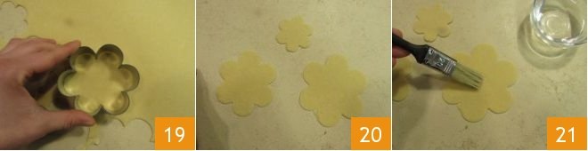 Use three flower shaped ring molds to cut the pastry, respectively 4, 3 1/3 inches (8 cm) and 2 inches (5 cm) in diameter 19, to obtain 24 flowers 20. Heat the seed oil to 290°F (145°C) and measure the temperature with a kitchen thermometer. Using a brush, dab a little water in the middle of the biggest flower 21,