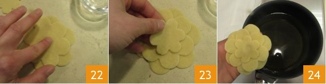 add the medium-sized flower so that the petals of both flowers alternate 22, dab some more water in the middle and add the smallest flower, once more so that the petals are overlapping, to create an alternating pattern 23. In this way you will make 8 roses consisting of three different-sized flowers. Upon reaching the right temperature, immerse your roses in the oil one at a time and fry them 24 while