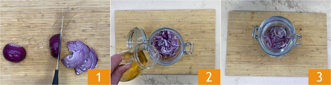 To prepare Catalan-style shrimp, first peel and slice the red onion 1, place it in a jar, cover with white wine vinegar 2, close and let marinate for 8 hours 3.