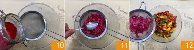 After the resting hours, take the marinated onions and drain them through a colander 10, press with the back of the spoon to squeeze them 11. Add the onions to the tomatoes 12.