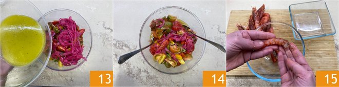 Season with part of the previously prepared emulsion 13, mix and set the salad aside 14. Take care of the shrimp: shell them by removing the tail, head, and carapace, also extract the black thread on the back 15.