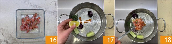 Once cleaned 16, prepare the flavored water: place a pot with water, onion, celery, carrot, and half a lemon 17 on the stove, bring to a boil. Immerse the shrimp 18 and blanch for a few seconds.