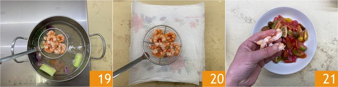 Drain the shrimp 19 and dry them on absorbent paper 20. Everything is ready to serve: on a serving plate, place the tomatoes and shrimp 21.