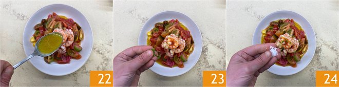 Season with the remaining emulsion 22, chopped chives 23, and salt 24. The Catalan-style shrimp are ready to be enjoyed.