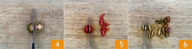Wash all the cherry tomatoes and cut them into wedges of the same size 123 and place them in a bowl.