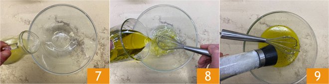 Separately, pour the lemon juice 7 and olive oil 8, add salt, pepper, and whisk to emulsify 9.