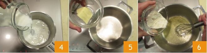 Meanwhile, prepare the béchamel: in a saucepan, heat the milk 4, while in another thick-bottomed pot gently melt the butter 5. Once melted, sprinkle the flour into the pot with the butter, stirring immediately with a whisk 6 to avoid lumps.