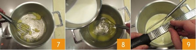 Lightly brown it 7 then add the hot milk, stirring immediately with a whisk 8. Continue stirring to prevent lumps; season with nutmeg 9, pepper, and salt and let the mixture thicken for a few minutes, always stirring.