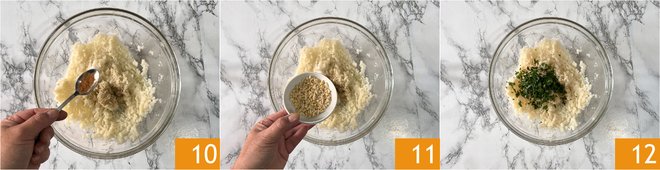 Season the puree with salt, pepper and nutmeg 10, then add the pine nuts 11 and the parsley 12.