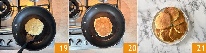 Cook for a couple of minutes and use a spatula to turn them over 19, then cook on the other side too 20. Once golden, place the cauliflower pancakes on a serving dish 21.