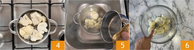 Cook for 15 minutes 4. Once tender, drain 5 the cauliflower (it should weigh around 13 oz), place it in a bowl and smash with a fork while still hot 6.