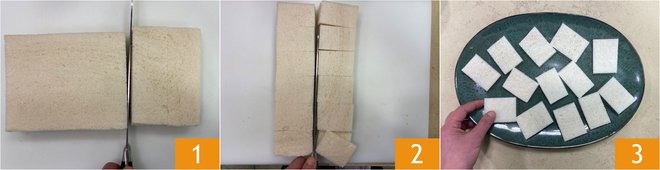 To prepare the caviar canapés, cut the sandwich bread into smaller, regular pieces 1 2; you can make 14 pieces from it. Arrange them on a serving tray 3.