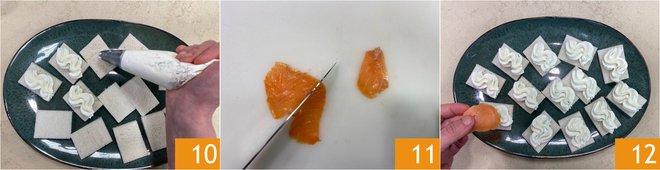 Dress each bread rectangle with the flavored cheese 10, then cut the smoked salmon into small pieces 11, and place it on each tartine 12.