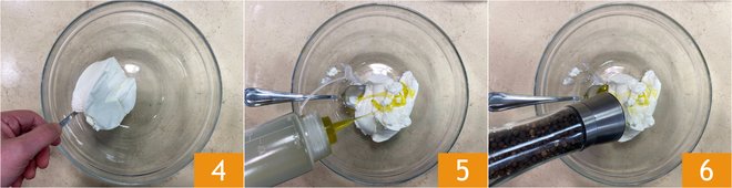 In a bowl, combine the cream cheese 4, season to taste with salt, olive oil 5, and pepper 6. Mix everything together.