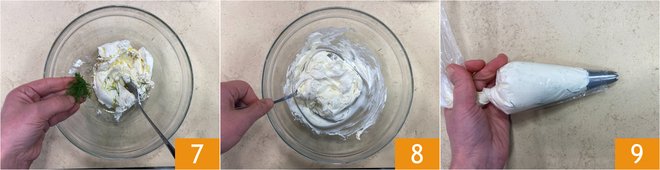 Finally, add dill leaves 7 and mix again 8 before transferring it to a pastry bag fitted with a star tip 9.