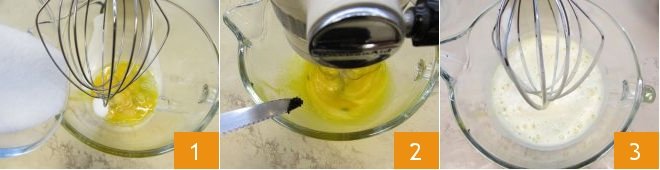 Now add the milk, at room temperature, and whisk gently 7: be sure to avoid the formation of lumps 8. Now add some of the egg and sugar mix to this dough 9,