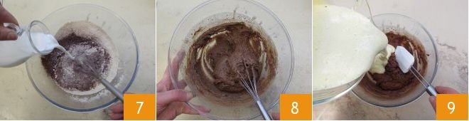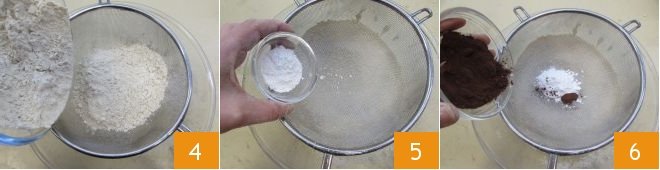 In the meantime, sieve the chestnut flour 4, baking powder 5 and cocoa 6 in a bowl.