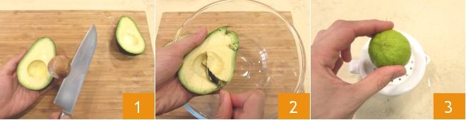 To prepare your chicken burritos with lime guacamole, start by making the guacamole. Cut the avocado in half and remove the pit 1, then use a spoon to scoop out the flesh from the skin 2 (for this operation, the avocado must be well-ripened), and place it in a bowl. Squeeze the lime 3.