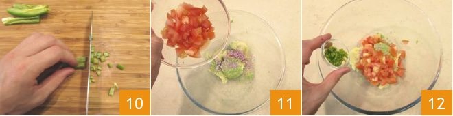 Then cut the chili into strips and then into small cubes 10. Add the shallot, tomato 11, and chopped chili to the avocado bowl 12.