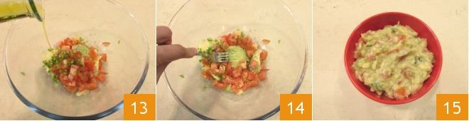 Season with a drizzle of oil 13, mix, and then, with the tines of a fork, carefully mash all the ingredients 14 until you get a sauce 15. The lime guacamole is ready, set it aside.