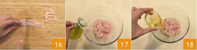 Now, prepare the chicken: cut the meat into strips 16, place them in a bowl, and drizzle with oil 17, honey 18.