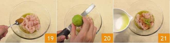 Add the cayenne pepper 19 and both the grated zest 20 and the squeezed juice 21 of the lime.