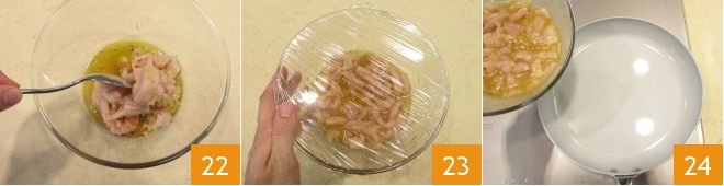 Mix 22 and then cover with plastic wrap 23. Let the chicken marinate in the fridge for at least half an hour, then heat a large pan and add the chicken with all its marinade juices 24.